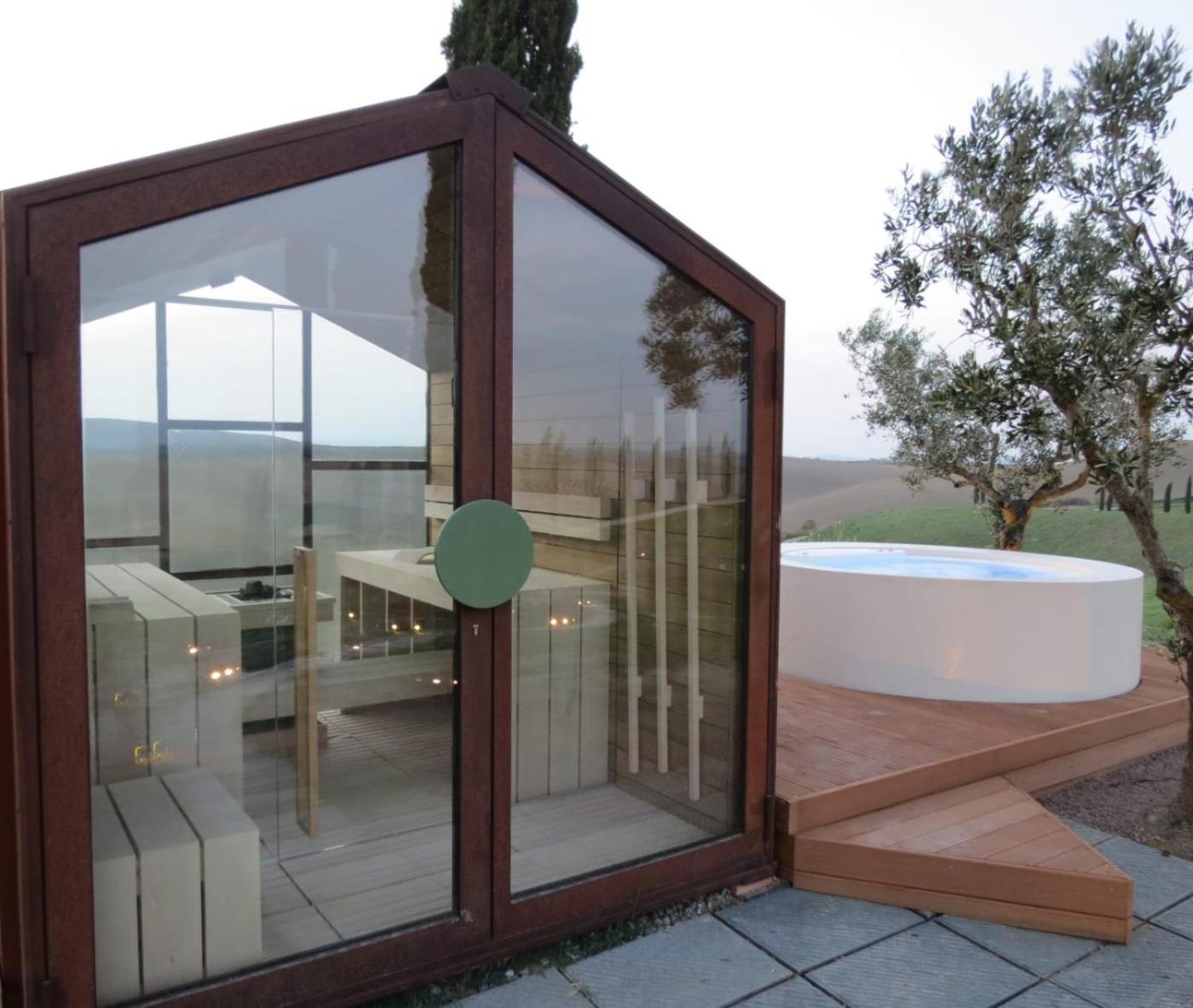 The property features an outdoor sauna and a heated hot tub with panoramic views.