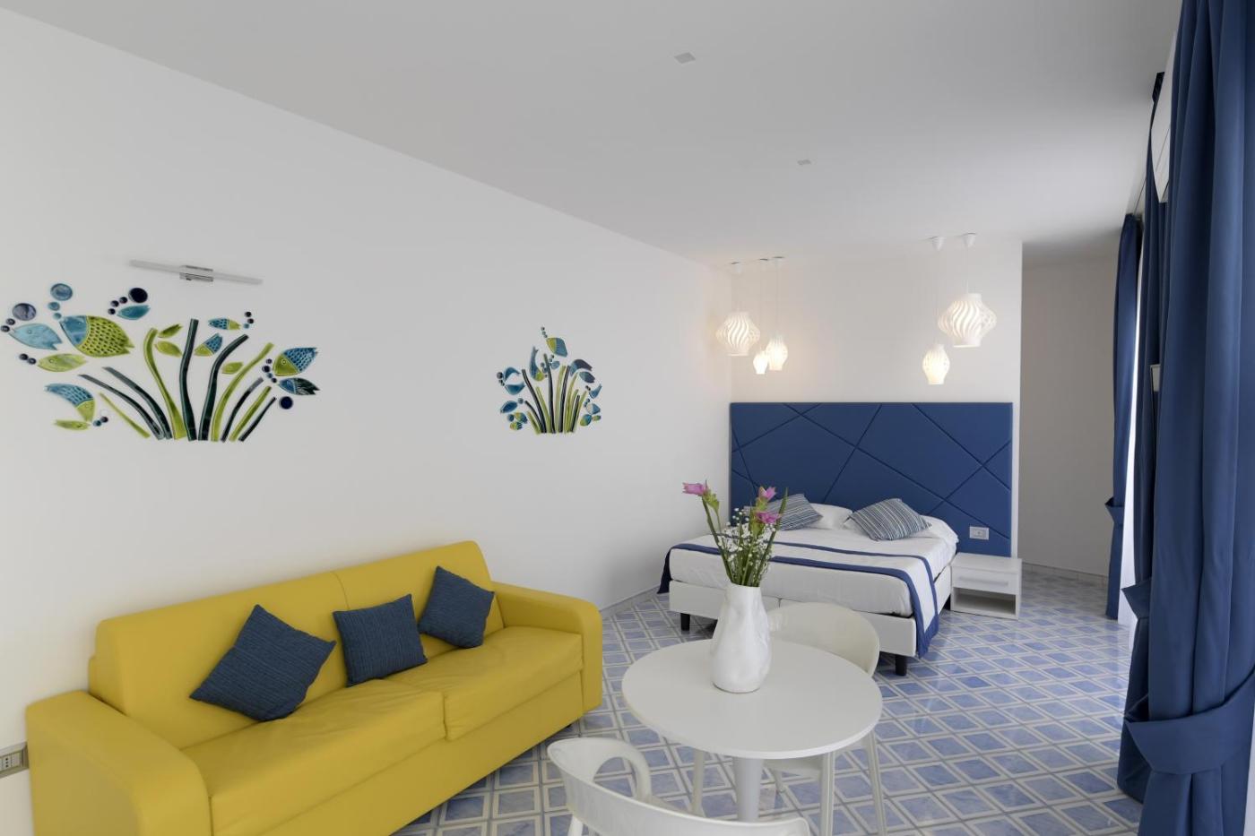 Family Suite. Featuring free toiletries and bathrobes, this family room includes a private bathroom with a shower, a bidet and a hairdryer. A kitchenette fitted with a stovetop, a refrigerator and kitchenware is available for cooking and storing food. The spacious air-conditioned family room features a flat-screen TV with cable channels, soundproof walls, a minibar, a tea and coffee maker as well as sea views. The unit has 2 beds. ;