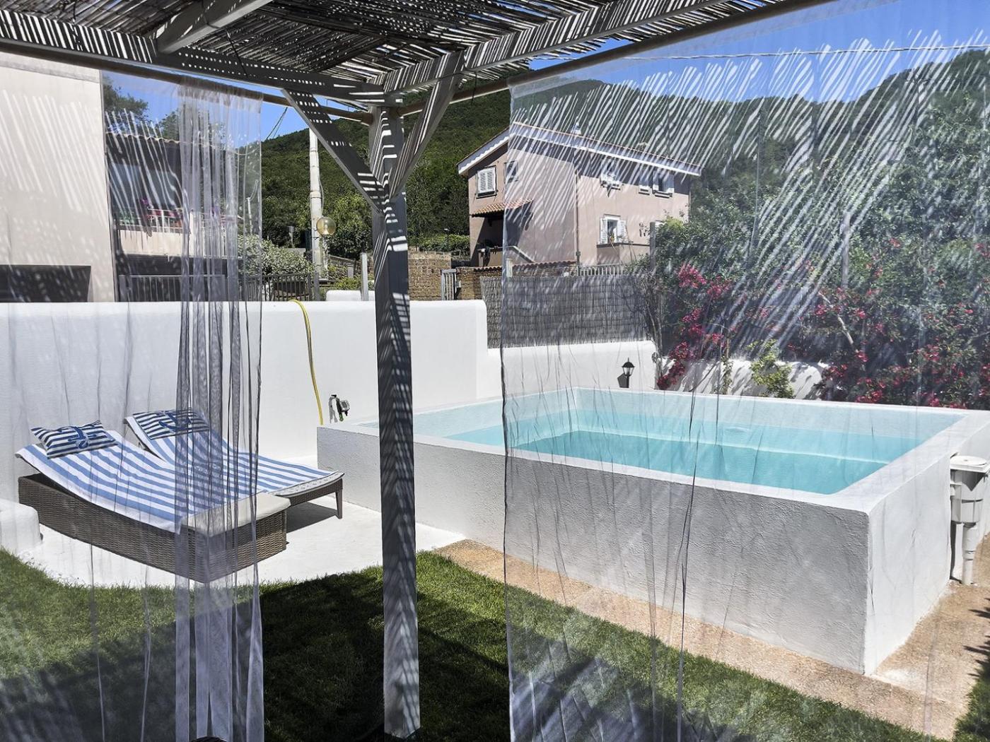 One-Bedroom House. This holiday home features a private pool. Boasting a private entrance, this air-conditioned holiday home features a kitchenette, 1 bedroom and 1 bathroom with a shower and a hairdryer. The holiday homes kitchenette, which has a stovetop and a refrigerator, is available for cooking and storing food. The holiday home features a TV, a washing machine, a coffee machine, a seating area as well as garden views. The unit has 1 bed.